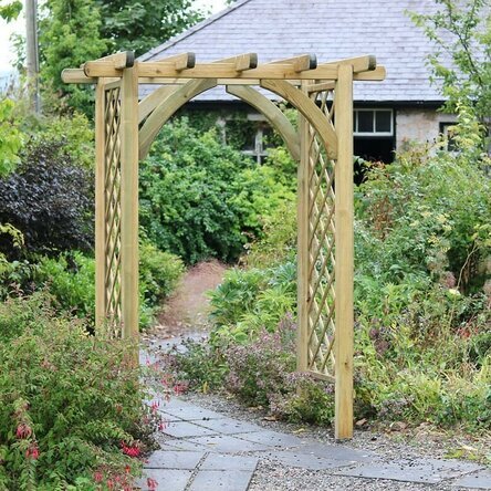 Кроме того, арку можно декорировать фигурными уличными фонарями или протянуть гирлянду по её периметру. Помимо декоративного эффекта, получится и функциональный: ночью она будет освещать двор дачи.