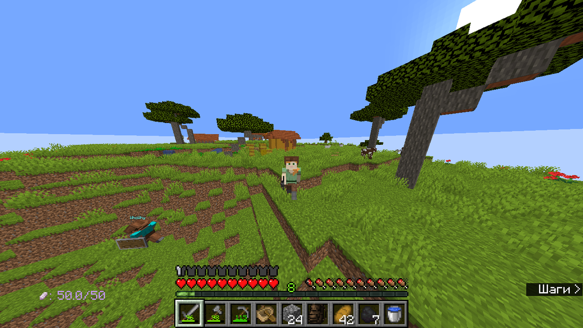 мы пошли дальше и мне дали шапку, теперь я дофига моднявый пока путешествовал на лодке нашёл как мне показалось, либо данж, либо что-нибудь классное а оказалось это просто фонарь действительно просто фонарь а вот сколько мы прошли сделал большой рюкзак сделал компас природы, подумали где будет дом, в общем пошёл к равнине нашёл кольцо на невидимость нашли место и построили просто склад и недолифт (4 скриншотов) решил построить портал в ад чтобы добыть песок душ, чтобы сделать нормальный быстрый лифт и добыл обсидиан пошёл добыл ламинарии ставлю ламинарии чтобы сделать всю воду источниками ломаю ламинарии и осталось только пойти в ад за песком душ поставил песок душ уииии нормальный быстрый лифт готов сделал алмазную мотыгу -0- сломав свой железный меч с босса-зомби получил алмазные ботинки и ещё немного поломанный железный меч с босса-скелета получил железный шлем(окультное отвращение добавляет хп) мини ферма догадался сделать скриншотов как бью босса и вот что выпало, вот только у