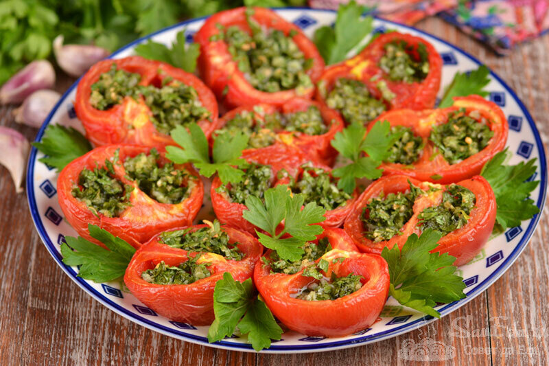 Такие фаршированные помидоры подаю и на закуску, и в качестве гарнира. На подготовку уходит не больше 10 минут, а на запекание потребуется 10-15 минут. Спелые мягкие помидоры готовятся быстрее. Блюдо очень простое в приготовлении, потребуется несколько простых продуктов. Помидоры после запекания становятся очень-очень ароматными и сочными. Порции 10 шт. Время подготовки 10 минут Время приготовления 15 минут Ингредиенты Инструкции 1. Петрушку нарезаем мелко, зубчики чеснока очищаем, пропускаем через пресс и отправляем все в миску. Немного солим, перчим и перемешиваем. 2. Помидоры среднего размера разрезаем пополам и вырезаем части около плодоножки. 3. С помощью чайной ложки вынимаем из половинок помидоров семена. Оставляем семена для приготовления супа или подливы. 4. Подготовленные половинки посыпаем солью. В углубления помидоров размещаем неплотно начинку из чеснока и петрушки. 5. Перекладываем фаршированные помидоры в форму, как у меня, или на противень, смазанны