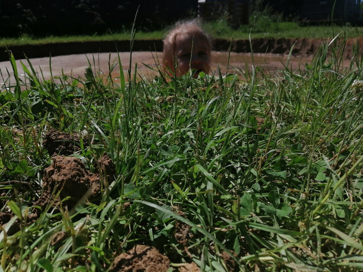 Снимаем дёрн, заглубляемся на штык лопаты. Это приблизительно 30 см. Мы решили более не заглубляться, поскольку в инструкции к бассейну рекомендована глубина 10-15 см. Поэтому штыка лопаты вполне достаточно.