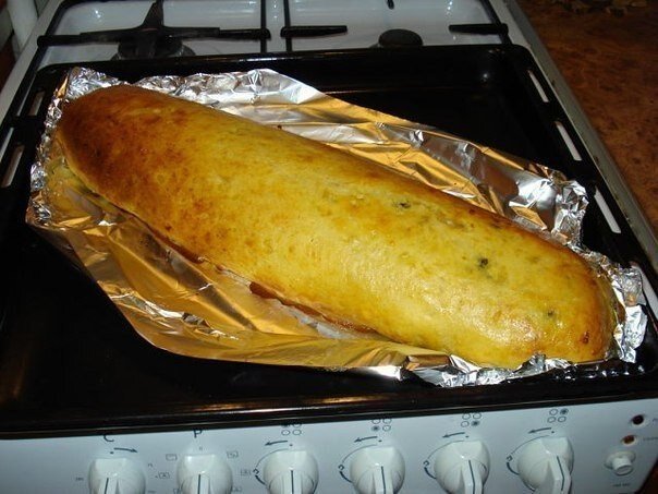 Ингредиенты: Картошку отварить 8 штук. Потом помять, добавить 2 стакана муки, 2 яйца. Приготовление: Полученну массу выложить на пищевую пленку. На картошку выложить обжаренные грибочки и кусочки грудки (тоже обжаренные). Скатать рулет. Выложить рулет на противень на фольгу, смазать яйцом и запекать до румяной корочки.