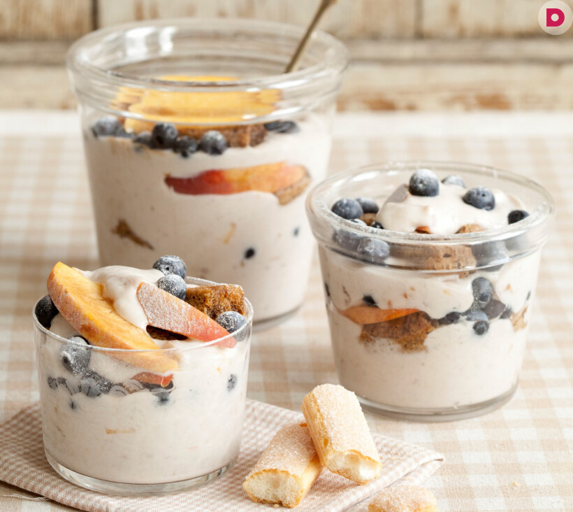 - Персики нарежьте тонкими дольками. Савоярди слегка пропитайте кофе. Для подачи в пиалу или стеклянную баночку выложите немного крема, сверху – часть пропитанных савоярди, ягоды и ломтики персика, затем снова крем, савоярди, ягоды и персики. Присыпьте оставшейся сахарной пудрой и уберите на полчаса в холодильник. Затем подавайте.