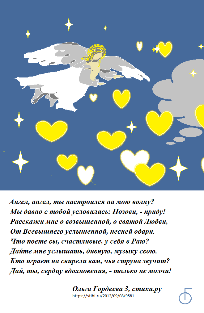 Предыдущий рассказ о помощи Ангела. ЕЩЕ ОДНА МОЯ ИСТОРИЯ О ПОМОЩИ АНГЕЛА-ХРАНИТЕЛЯ. Была ночь, я спала в своей постели. Вдруг я почувствовала, как мое тело приподнимается над кроватью и двигается по горизонтали в сторону подушки. Причем, я не могу пошевелить ни руками, ни ногами. В голове проносятся сразу несколько мыслей: «Что со мной происходит? Сейчас я ударюсь головой о спинку кровати. Где мой Ангел-хранитель?» Я хочу закричать, но… ничего не получается. Только мысленно зову: «Ангел, Ангел, где ты? Помоги». После этого, чувствую, как сразу опускаюсь на кровать. Конечно, я очень испугалась, но поняла, что мой Ангел-хранитель всегда рядом и ждет моего призыва о помощи. Были и другие ситуации, в которых помогал Ангел-хранитель. Поэтому я посвятила ему свои стихи. Они опубликованы на моей страничке на сайте стихи.ру. под именем Ольга Гордеева 3. Здесь я публикую свои компьютерные рисунки со стихами в виде открыток, которые можно сохранить себе. Ангел . https://stihi.ru/2012/09/08