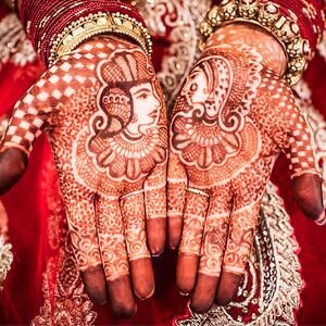 Полностью заполненные руки хной характерны для индийского дизайна мехенди и при этом используются различные варианты элементов. Чаще всего они состоят из пэйсли или павлинов. Индийское свадебное мехенди, особенно в северных районах Индии, часто можек включать в себя раджу и рани - король и его королева. Индийские узоры в центре руки - мандалы. Они имеют круглое основание (центр) и построены симметрично вокруг центра. Самая простая ф