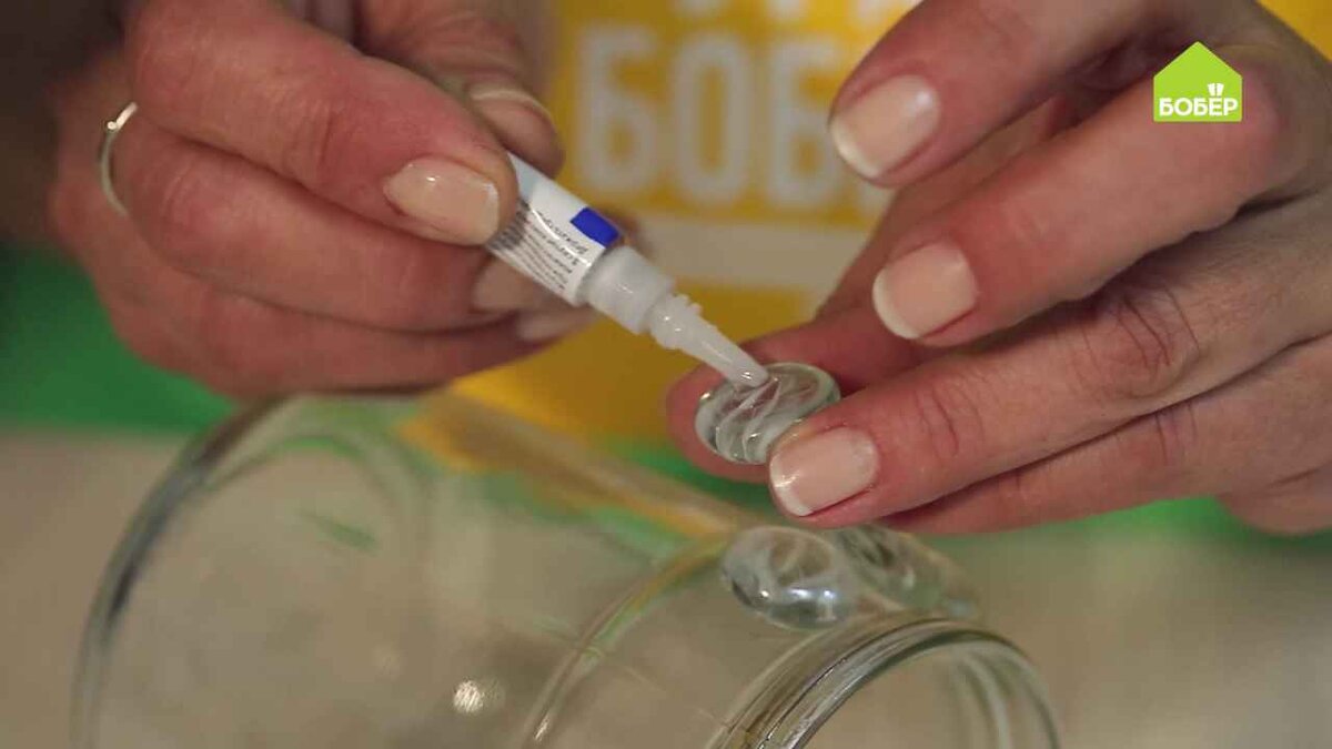 Нанесите каплю клея на стеклянный камень марблс и приклейте его к банке.