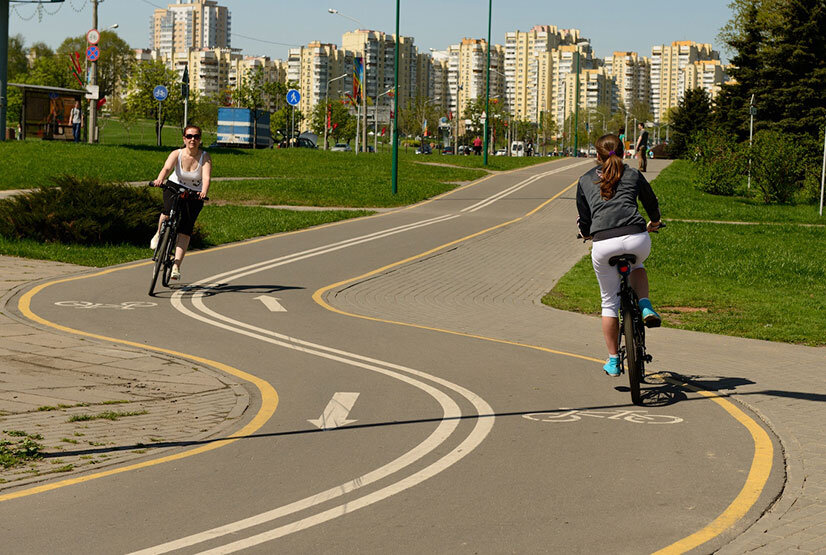 На улицах городов, где кроме велосипедистов много машин и пешеходов, асфальтовые дорожка отвоевываются у двух последних участников движения. Раз покрытие в таких местах уже есть, то не имеет особого смысла его переделывать, достаточно просто выделить дорожку и нанести на нее разметку краской. В парках и скверах, можно сделать более интересное покрытие - акриловое. В местах массового катания на велосипедах, а особенно там, где тренируются экстрималы, выполняющие различные по сложности трюки, подойдет полотно из резиновой крошки.