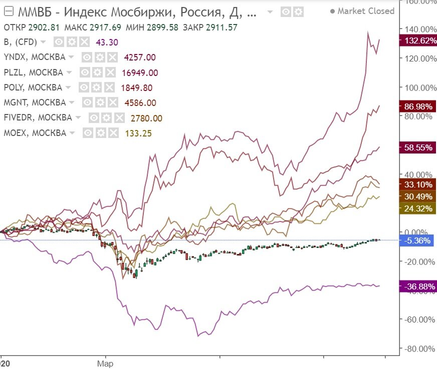 На начало 2020 года индекс ММВБ составлял 3059 пунктов (-5,4% с начала года), нефть марки Brent стоила 69$ (-37$). При этом на Московской бирже есть ряд компаний, которые смогли показать значительный рост на этом фоне. Отмечу, что я отбирал только акции 1-2 эшелона с ростом выше 10%. 1. Полюс (+132%), Полиметалл (+87%). Такой рост спровоцировала сильно поднявшаяся стоимость золота (+25%) за последние полгода. Золото, как известно, считается традиционным защитным инструментом и вследствие событий, связанных с вирусом, падения котировок нефти и обвала на мировых фондовых рынках, инвесторы ринулись закупать ценные металлы. Все это отразилось на акциях основных золотодобытчиков. 2. Яндекс (+59%). Данная компания - единственный серьезный представитель IT сектора на Московской бирже. К тому же многопрофильная и бурно развивающаяся. Акции спустя месяц после падения рынков восстановились, что говорит о лояльном отношении инвесторов к Яндексу. Коронавирус и прочие явления слабо отражаются на
