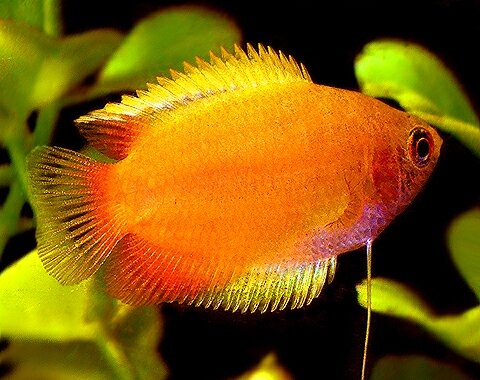 Всем привет ! Медовый гурами - вид лабиринтовых рыб из семейства макроподовых . Очень распространённая аквариумная рыбка . Взрослые особи достигают размера до пяти сантиметров . Окрас варьируется от серебристо - серого до светло - жёлтого . Во время нереста окрас самцов заметно меняется , он становится более ярким и насыщенным , плавники становятся насыщенного медового или оранжево - красного цвета . Медовый гурами не требователен к условиям содержания . Аквариум необходимо оборудовать аэратором , освещением и обогревателем . Фильтр желательно подобрать с таким условием , чтобы он не создавал сильные потоки , так как медовый гурами предпочитает слабое течение . Обязательно наличие крышки на аквариуме . Оформить аквариум следует укрытиями , растениями и тёмным грунтом . Медовый гурами - спокойные и миролюбивые , поэтому в качестве соседей лучше отдать предпочтение небольшим и спокойным рыбкам . Не забывайте , что прежде чем запустить новую рыбку в общий аквариум , она должна побыт