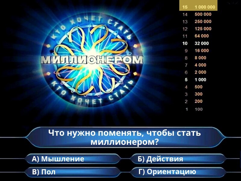 Когда людей не устраивает результат, они обычно меняют действия. Но нужно идти дальше и менять свое мышление - оно стоит выше действий. Схема выглядит так: 1 – Мышление 2 – Действия 3 – Результат Для начала необходимо поменять свое мышление. Тогда и действия изменятся сами собой, а значит - ты автоматически получишь новые результаты. Глупо решать проблему с тем же мышлением, из-за которого эта проблема и была создана. Не нужно быть миллионером, чтобы жить, как миллионер. Нужно иметь мышление миллионера, и деньги придут. Если ты никогда прежде не думал, как относишься к деньгам – задумайся сейчас. Какие мысли о деньгах приходят в голову? Есть ли у тебя похожие мысли? «Я не знаю, как заработать много денег» «Богатый человек - значит вор или мошенник» «Не в деньгах счастье» «Деньги – зло» «Деньги - это просто бумажки» «Деньги любят богатых» Или мой любимый пример: Вот если красивая девушка едет на крутой тачке - значит насосала и точка) И никто не думает, ч