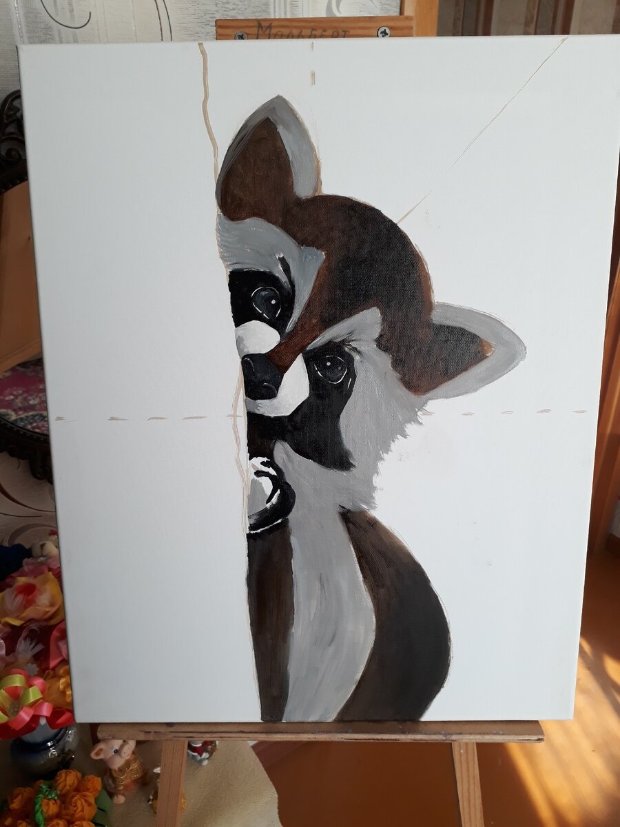 После подмалёвка енота мы переходим к фону. Разбавляем черный цвет с белым и рисуем кору дерева. Потом пальцами наносим зеленые и жёлтые цвета позади енота. Смягчаем границы, чтобы не было резких переходов.
