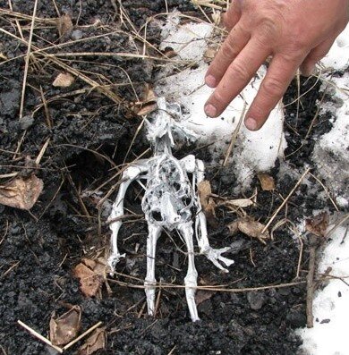 Надо сказать, что сарай, стоящий во дворе Виктора, построен на сваях, поэтому в провал в полу была видна земля. А на земле лежал маленький скелет неизвестного существа.И МЫШОНОК, НИ ЛЯГУШКА, А НЕВЕДОМА ЗВЕРУШКА?