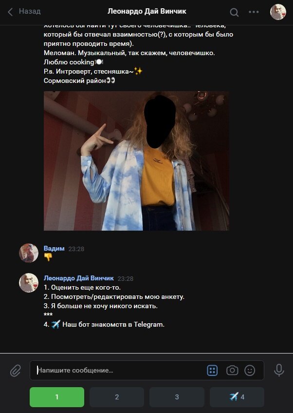 Знаете ли вы про такую группу для знакомств Леонардо Дай Винчик ? Наверняка да, так как в ней уже 11 000 000 участников, там нужно просматривать анкеты, ставить лайки и подобное, НО имеется ли смысл сидеть там и листать ленту с анкетами, в надежде найти себе пару по душе? Отвечу сразу - НЕТ. На собственном примере объясняю почему: 1. В этой группе в основном сидят только малолетние дети, которые ищут либо друзей, либо просто дурачатся, то есть если вам больше 18-ти, этот вариант поиска своей любви отпадает. 2. Если вам удалось найти красивую девушку или парня, в 90% случаев, что это либо закрытый аккаунт, который ни на какие ваши ''привет'' не ответит вам ничего, либо это пиар инстаграмма, либо обычный фейк, созданный просто для развлечения. 3. Когда в своем городе вы пролистайте всех людей, то они начнут повторятся, это я замечал уже не раз, что указывает на возможную накрутку подписчиков в группе.+ Все это я вывел из 2 месяцев пользования этим ''сайтом для знакомств''. Ну а нужно л