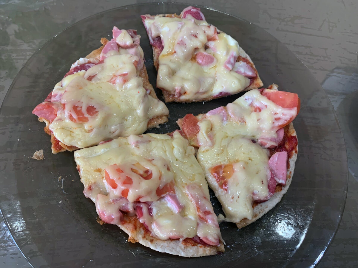 Сделать такую пиццу сможет даже ребенок, делается максимум 10 минут, а на вкус получается просто объедение. В конце будет детальный подсчет стоимости 1 пиццы, а сейчас давайте переходить к приготовлению. Вот что я купил в магазине, кроме помидорки, она своя. Так же понадобится кетчуп и майонез. Продукты я покупал в "Магните". Натираем сыр, режем пополам нашу колбаску, небольшое количество помидора, отвариваем и нарезаем сосиску. И так начинаем приготовление: 1. Слегка прогреваем сковороду с небольшим количеством масла, делам минимальный газ и кладем нашу лепешку. 2. Лепешку смазываем небольшим количеством кетчупа и выкладываем колбасу и сосиску. 3. Сверху добавляем и размазываем небольшое количество майонеза и выкладываем помидор. 4. Хорошенько посыпаем все тертым сыром и накрываем крышкой. 5. Ждем пока сыр расплавится, у нас получилось около 5 минут. Теперь аккуратно перекладываем на тарелку, разрезаем и наслаждаемся. Быстро, вкусно, экономно. Перейдем теперь к подсчету стоимости наш