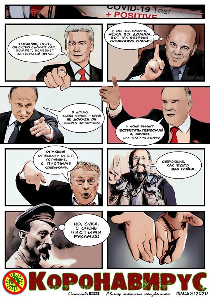 Ранней весной этого года рунет взорвал перл пожелавшего остаться неизвестным автора - про коронавирус и самоизоляцию. Мне он тоже понравился, настолько, что я решил его... визуализировать. Решил и сделал - одностраничный комикс - стрип. Специально не шаржировал персонажей, ибо к каждому из них отношусь с уважением. И, да. Я знаю, что режим самоизоляции был продлён до 12 мая и мечта Геннадия Адреевича Зюганова осталась несбыточной, увы... Сегодня многое уже изменилось, однако, ещё раз без злобы посмеяться нам ничто не мешает...