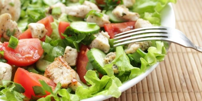 - 3.Замаринованную птицу зарумянить на гриле без масла. Порезать аккуратными и приблизительно одинаковыми по размеру кусочками. Высыпать в общую миску.