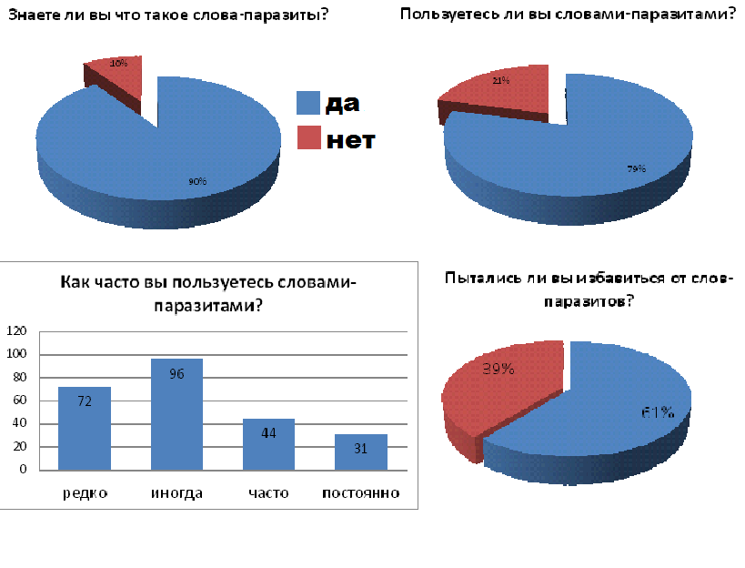 Для того чтобы узнать о роли слов-паразитов в обществе, мы провели опрос среди 460 людей разных возрастов (от 7 лет до 61 года). Вопросов было 4, для ответа на них, задумываться особо не требовалось. 1. Знаете ли вы что такое слова-паразиты? 2. Пользуетесь ли вы ими? 3. Как часто? 4. Пытались от них избавиться? На первый вопрос положительно ответило 415 человек, однако, всё же не все из них дают правильное определение словам-паразитам. Многие считают за сорняки речи только брань, но это не так. В них также входят эвфемизмы, о которых можно прочитать в моей самой первой статье. Исходя из того, что некоторые за слова-паразиты принимали мат, то и на второй вопрос многие ответили «нет». Однако и тех, кто признаёт проблему своей речи, было немало-328 человек. На третий вопрос: «как часто вы пользуетесь словами-паразитами» можно было ответить одним из 3 вариантов: редко, иногда, часто, постоянно. Больше всего людей ответили, что пользуются лишь иногда, таких 96. Ответивших «редко»
