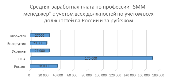 Исходя из данных, представленных на таблице, мы можем понять, что заработная плата для SMM-менеджера в США на много выше, чем в странах СНГ. Также специальность менеджера социальных сетей представляет собой конкурентную профессию, именно поэтому найти высокооплачиваемые должности будет трудно как в России, так и за рубежом.