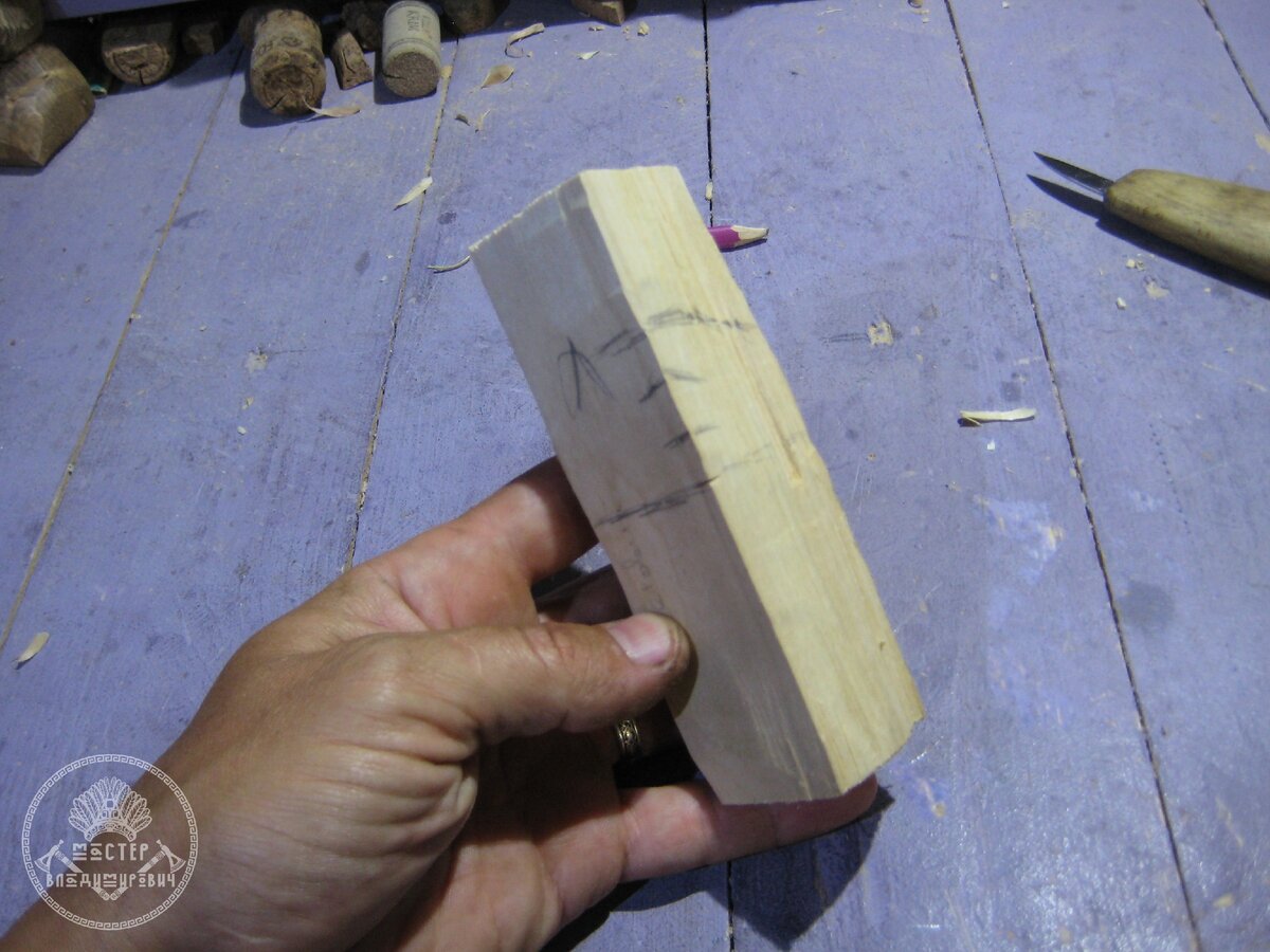Можно использовать любое дерево. У меня это липа и понятно почему. Она очень легко режется во всех направлениях. Брусок шириной примерно 3.5 сантиметра. Ну и высота бруска около 12 сантиметров.