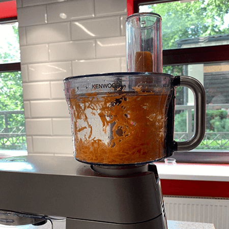 Пожалуй, самая любимая моя насадка, очень функциональная и удобная. В комплекте у меня шесть дисков для нарезки слайсами, тёрки и шинковки, а ещё универсальный нож. Ножом можно отлично сделать ореховое пралине, быстро приготовить салат или заправку для борща. Ещё этим ножом отлично получается сделать печёночный паштет, и даже если вы не особо любите печёнку — попробуйте, там её вкус почти не заметен!