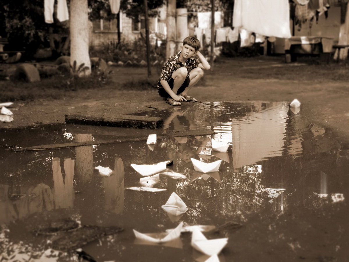 Во-вторых, кораблики. У нас на Войковской во дворах по весне были море и реки. А рядом с нашим домом - мебельный магазин. Воткнул в досочку палочку с картонкой - вот и кораблик. Папа научил выстругивать кораблик с килем, утяжелять гвоздиками палубу и делать правильный парус. Мои кораблики плавали дальше всех и никогда не переворачивались.