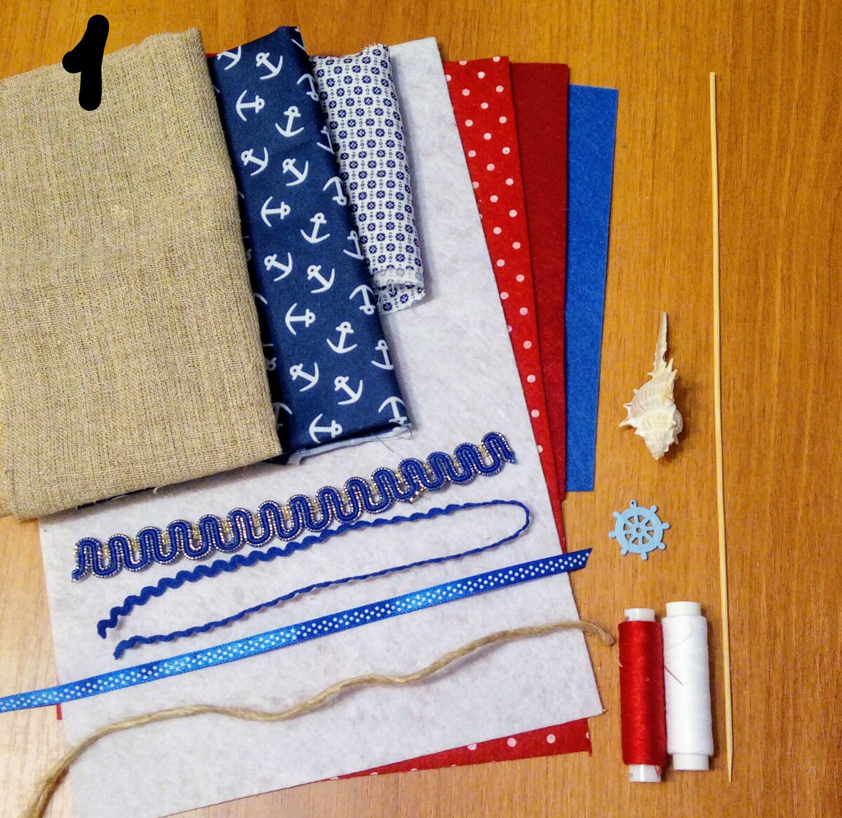 1. Для работы нам понадобятся: ткани синей и светлой расцветки, ткань рогожка бежевая, фетр: белый, синий, красный, красный в белый горошек, тонкая атласная синяя ленточка, кусок шпагата, волнистая синяя тесьма широкая и узкая, нитки швейные- белые и красные, длинная деревянная шпажка или палочка для суши, синтепон, клеевой пистолет, украшение "штурвал", ракушка, кусочек картона.