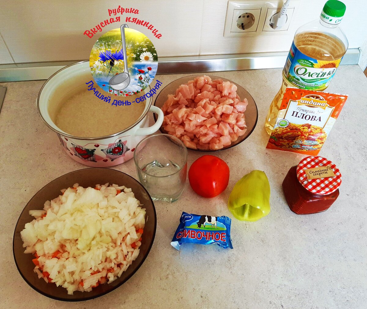 Плов люблю с детства, и пробовала его в самом разном исполнении. В ресторанах наиболее нравится вариант приготовления #плов в казане на плите, дома предпочитаю готовить в духовке. Блюдо само по себе не диетическое, поэтому для приготовления плова в домашних условиях мясо беру наименее жирное – куриную грудку. Итак, #плов - подготавливаю ингредиенты: - 800 грамм порезанной на небольшие кусочки куриной грудку; - два 300 граммовых стакана круглозерного риса; - три луковицы и две морковки: все мелко порезать; - пакет приправы для плова; - один помидор и один зеленый болгарский перец; - треть чайной ложки абхазской аджики; - 100 грамм сливочного масла; - 150-200 грамм растительного масла; - чуть больше половины столовой ложки соли; Процесс приготовления следующий: Первый этап - два стакана риса хорошо промываю проточной водой, заливаю чистой водой и отставляю в сторону. Нарезаю мелко лук и морковку. Отставляю в сторону, и занимаюсь нарезкой куриной грудки. Когда данная процедура завершена