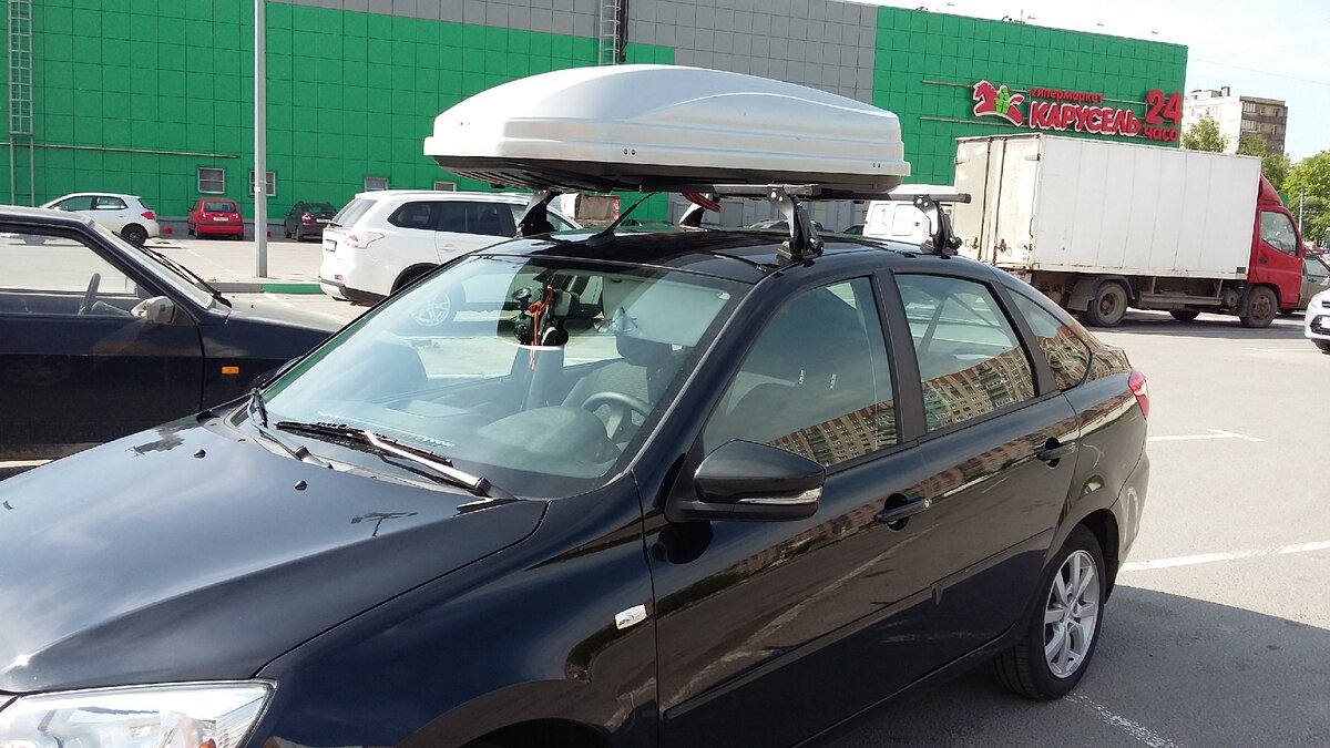 Теперь этот автобокс успешно перекочевал на Ладу Калину Кросс и очень гармонично вписался в интерьер машины, потому как у Кроссовой версии крыша прямая и на длину всего автомобиля.