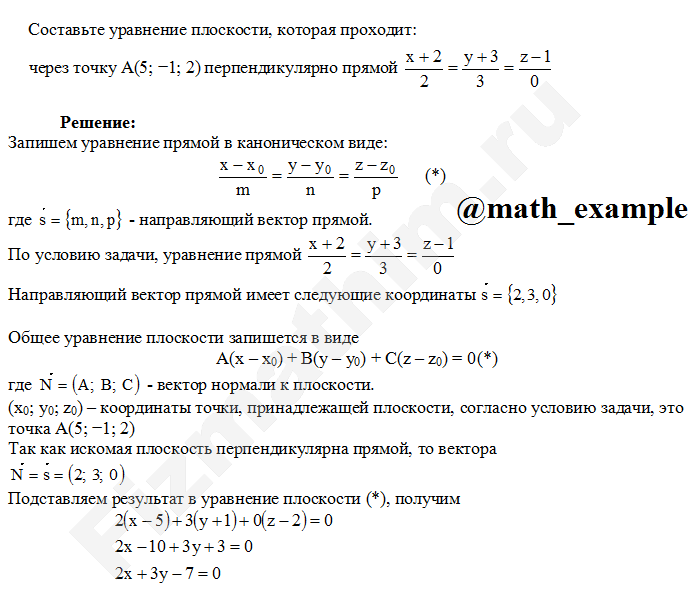 Составление уравнения плоскости через точку A перпендикулярно прямой пример 1.