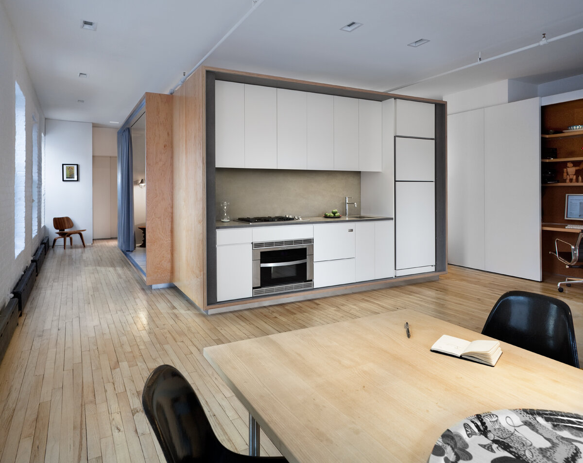 Существует множество различных подходов, которые можно выбрать при ремонте квартиры. Иногда достаточно нескольких небольших изменений, чтобы изменить атмосферу, но в других случаях требуется что-то более радикальное. В случае этого лофта, расположенного в Нью-Йорке, ремонт был полным и действительно впечатляющим.Лофт площадью 900 кв. футов (примерно 83 кв. м) был реконструирован компанией LYNCH / EISINGER / DESIGN, практикой которой руководят архитекторы, считающие основными характеристиками хорошего дизайна эффективность и гибкость, которые были мастерски материализованы в этом проекте. Первым шагом было убрать все перегородки и полностью открыть чердак. Кухня небольшая и имеет серые цементные стены. Мебель белая, а бытовая техника встроенная. Напротив него находится жилая площадь, также ограниченная и сохраненная непринужденно и просто, но все еще достаточно места для обеденного стола. Отличительной чертой лофта является длинный белый лакированный шкаф. Когда его двери закрыты, он мо