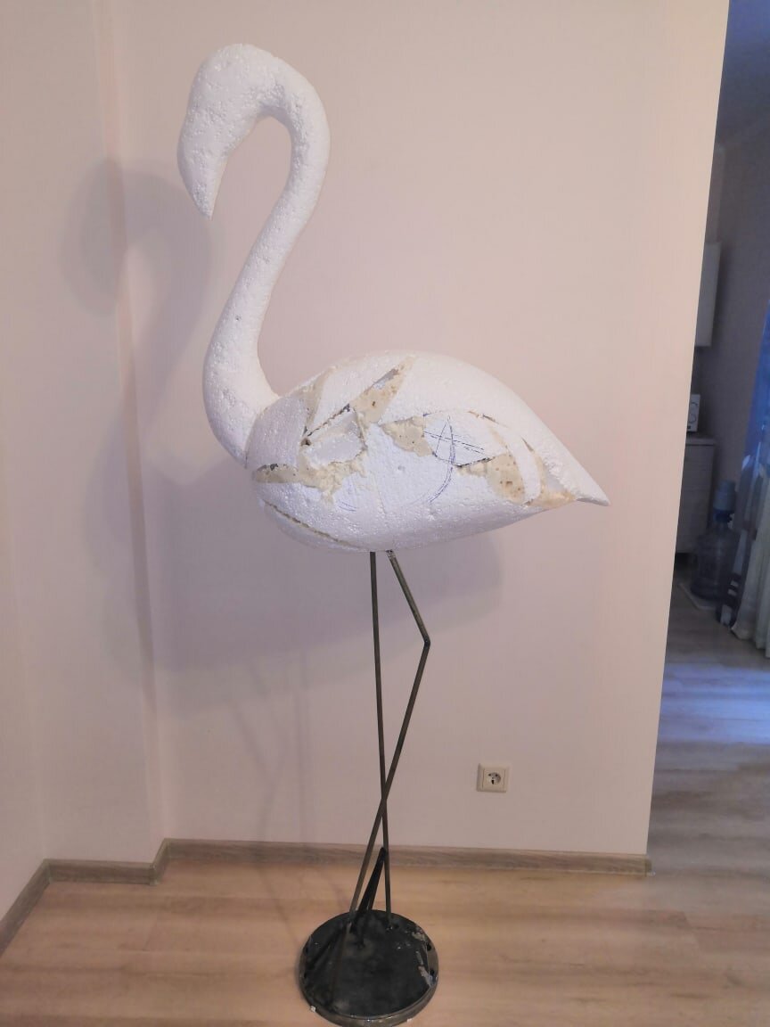 Сегодня я поделюсь с вами историей, с которой и началась моя работа с пенопластом. Листала я как-то ленту инстаграмм и увидела фламинго. Начала искать в интернете фигуры из пенопласта и как их сделать. Ничего конкретного не нашла. Решила попробовать сама "на обум". Сделала туловище и пришло время ставить его на ноги. Взяла метталопластиковую трубу, но туловище не держалось. Тогда я начала думать "как и из чего сделать основу". Купила арматуру и пошла к сварщикам. Каркас готов, оставалось только поставить туловище и тут еще одна проблемка. Я не знаю как готовое туловище поставить на ноги. Кое как решился вопрос. Пришло время укреплять конструкцию. Взяла алебастр и принялась за работу, дальше шпаклевка. Все получалось такое не ровное, что я была в расстроенных чувствах. Думаю ладно, за декорирую. Взяла изолон и вырезала перья. Вставила в туловище, покрасила и вот результат. Другого фламинго я делала уже совсем по другому