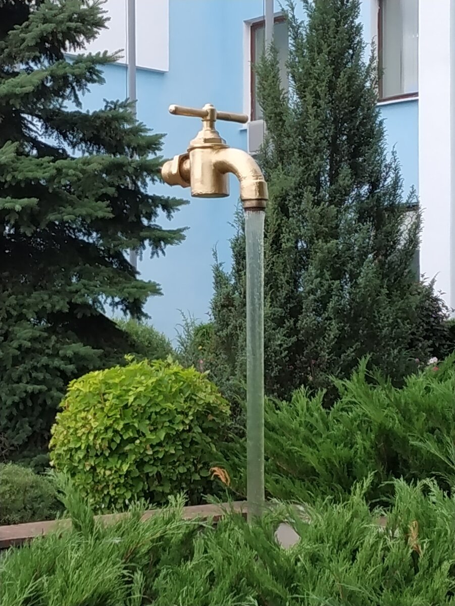 Наткнулись на неё мы случайно, малоприметный, но очень интересный фонтан установлен во дворе на входе в филиал «Бобруйскводоканал» УПКП ВКХ «Могилевоблводоканал» в Бобруйске (да-да такие у нас официальные названия). Предприятие расположено на отшибе города, поэтому кроме проблемных горожан у которых с водой "не фонтан", мало туристов и зевак добретают сюда чтобы лицезреть это диво. А взглянуть есть на что. Мы потратили немало времени чтобы понять как это работает.