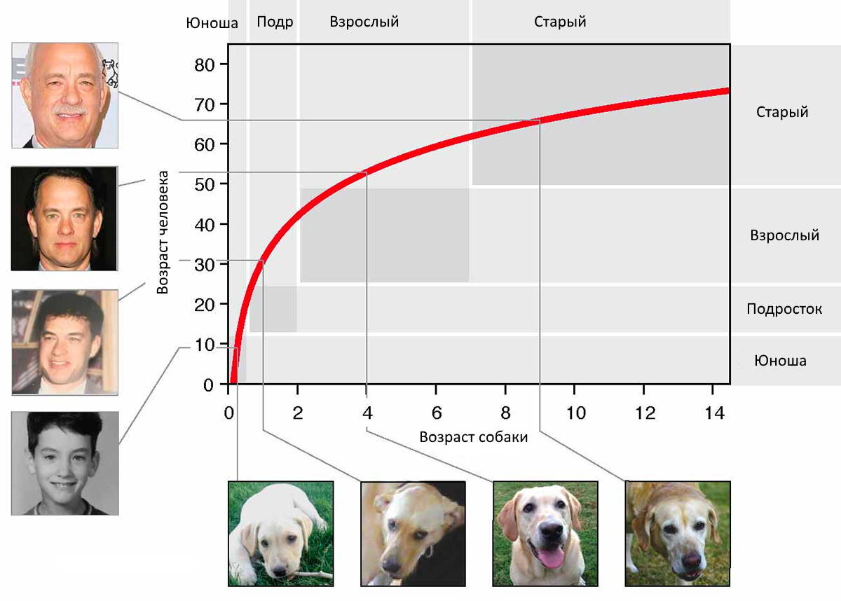 Приходит время, когда мы-владельцы четвероногих любимцев задумываемся о том, а сколько лет нашему питомцу по человеческим меркам? Большое влияние оказывает возраст на особенности развития и поведения, как человека, так и домашних животных. Зная возраст своего домашнего любимца, мы можем правильно понимать и ухаживать за своим питомцем более качественно и тем самым продлевать любимому хвостику жизнь! Под уходом понимается правильное питание, уход за здоровьем и внешним видом (своевременное посещение ветеринара и грумера), правильная физическая интенсивность нагрузок (прогулки, игры, сон) и конечно же любовь и забота владельца! Многие хозяева собачек предположительно думают, что 1 год жизни собачки равен 7 человеческим годам. Однако ученые отметили тот факт, что к 1 году жизни, собаки достигают подросткового периода, эквивалентного 15-и человеческим годам, так же применимо, как и к кошкам. А дальше принцип определения «человеческого» возраста питомца будет отличаться в зависимости от п