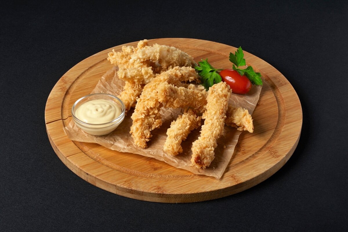 Сегодня у нас, домашние куриные стрипсы. На самом деле, не так уж и сложно их приготовить. Итак, начнем: 1. Нарезать куриное филе на тонкие полосы. 2. Замариновать в горчице с солью на 1 час. 3. Обвалять каждый кусочек в панировочных сухарях. Любители острого могут смешать панировочные сухари с острым красным перцем. 4. Растительное масло разогреть на сковороде и обжарить куриные стрипсы до золотистой корочки с одной стороны, а потом с другой. 5. Готовые стрипсы выложить на бумажное полотенце, чтобы убрать лишний жир. 6. Подавать куриные стрипсы с любым гарниром.