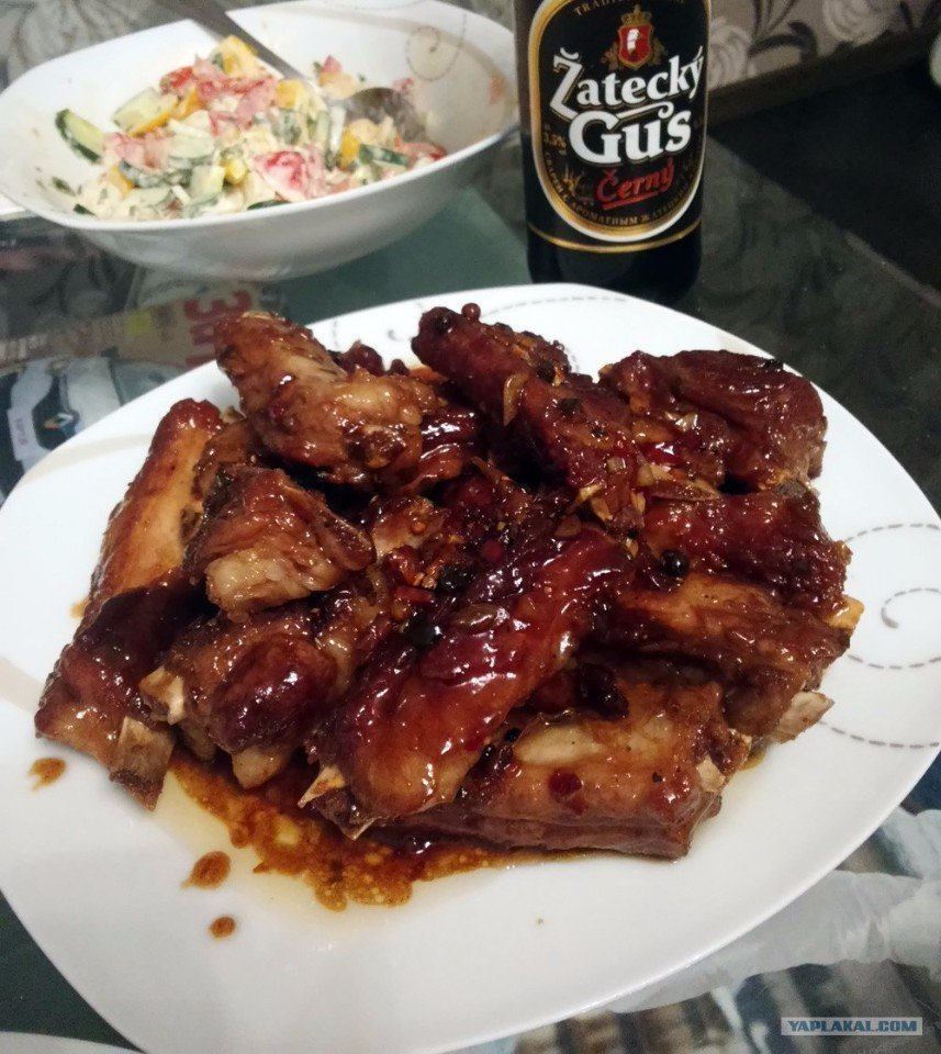 Не убавляя огня (или электричества), выливаем маринад на сковороду. Пока все это 10-12 минут адово кипит и выпаривается, налить в кружку еще пива и подпереть спиной дверь в кухню, на стуки извне не обращать внимания. Через 10-12 минут, когда маринад густо забулькает и карамелизуется, убавить огонь до среднего, и еще 3-4 минуты активно переворачивать ребра, со всех сторон макая в соус. Выкладываем на тарелку, сверху поливаем соусом со сковороды. Гарнир – на свой вкус.