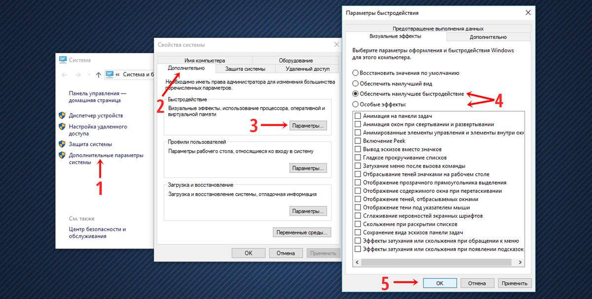 В Windows 10 есть внизу на панели задач строка поиска .В строке пишем "Cистема". В появившимся окошке ищем надпись '' Дополнительные параметры системы" . После нажатия у вас появится окно "Cвойства системы" вкладка "дополнительно" . И находим надпись " Быстродействие" Затем кликаем параметры. Из четырех вариантов выбираем "Обеспечить наилучшее быстродействие" .Применить. Ок.