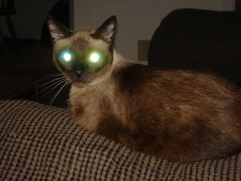 Миф. Грациозное животное было верной спутницей богини Бастет, живущей на Луне. Каждую ночь божество спускалось на землю и защищало людей и их скот от нападок хищников. Но не всегда Бастет могла посещать землю – в ее обязанности входили и другие дела. Чтобы не оставлять людей без присмотра, богиня ниспослала на Землю свою верную служанку – грациозную кошку. С тех пор кошка живет подле людей, лечит их, оберегает и каждую ночь докладывает о выполненных задачах своей повелительнице. В эти моменты у животного «включаются» глаза – она общается с владычицей. Как оно на самом деле? У некоторых животных, в том числе и кошки, глаза способны улавливать и максимально использовать самое слабое световое излучение, благодаря особенности их строения. Внутренняя поверхность глаза этих животных имеет блестящий слой, так называемое зеркало, которое отражает падающий свет. Глаза ночных хищных животных не производят свет, а лишь отражают слабые лучи звезд, Луны, отдаленных источников света,