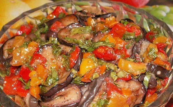 ИНГРЕДИЕНТЫ: Баклажан- 2 килограмма Томатная паста- 800 граммов Чеснок- 150 граммов Масло растительное (подсолнечное)- 1 стакан Сахар- 2 стакана Уксус 9%- 2 столовые ложки Соль- 2 столовые ложки Перец болгарский- 12 штук Петрушка (зелень)- по вкусу РЕЦЕПТ ПРИГОТОВЛЕНИЯ: Делаем томатный сок из концентрированной томатной пасты. Для этого разбавляем 800 г пасты водой до получения 3 л сока. Добавляем в полученный сок растительное масло, сахар, соль и уксус согласно рецепту. Баклажаны нарезаем с кожурой, не очищая, полукругами, перец нарезаем соломкой, чеснок рубим на мелкие кусочки. Все измельченные овощи кладем в томатный сок и тушим их на очень медленном огне около 30 мин., до полной готовности. Раскладываем полученный салат по банкам и консервируем обычным способом.