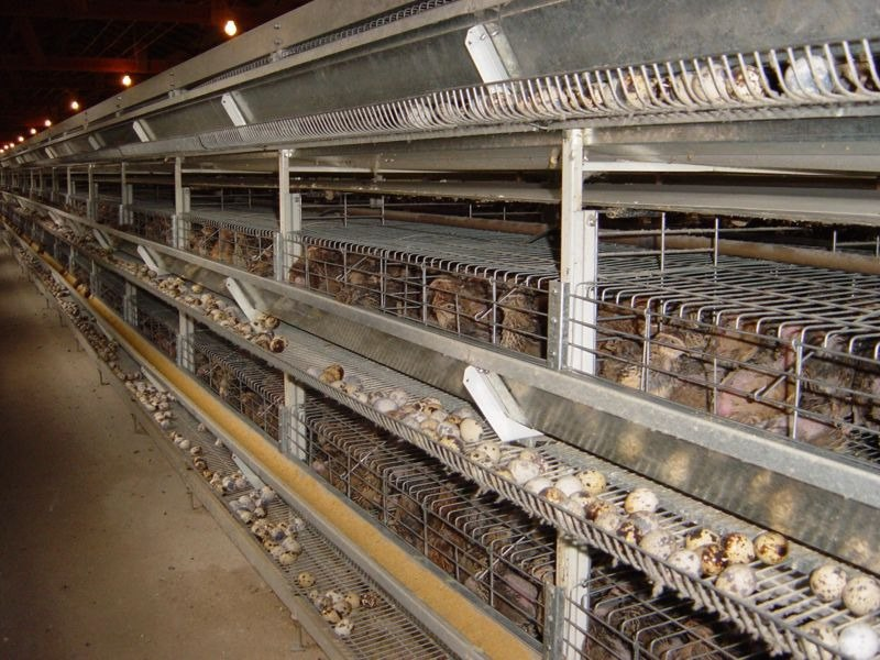 Другое преимущество — исключительная компактность производства. Как правило, перепелов держат в «батареях» из нескольких клеток, сделанных из металлической сетки. На площади 0,5 кв. метров можно держать 100 птиц. В батарее на шесть клеток помещается до 280 перепелов, а места она занимает меньше квадратного метра.