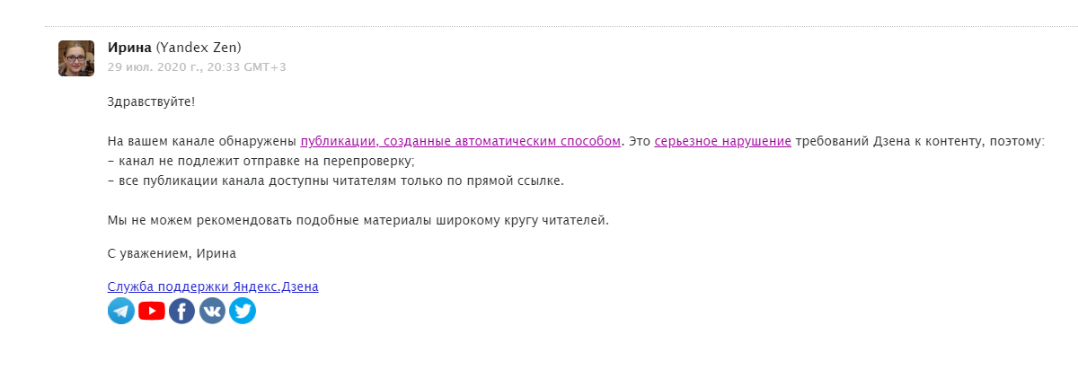 Моё второе обращение в техническую поддержку Яндекс Дзен.