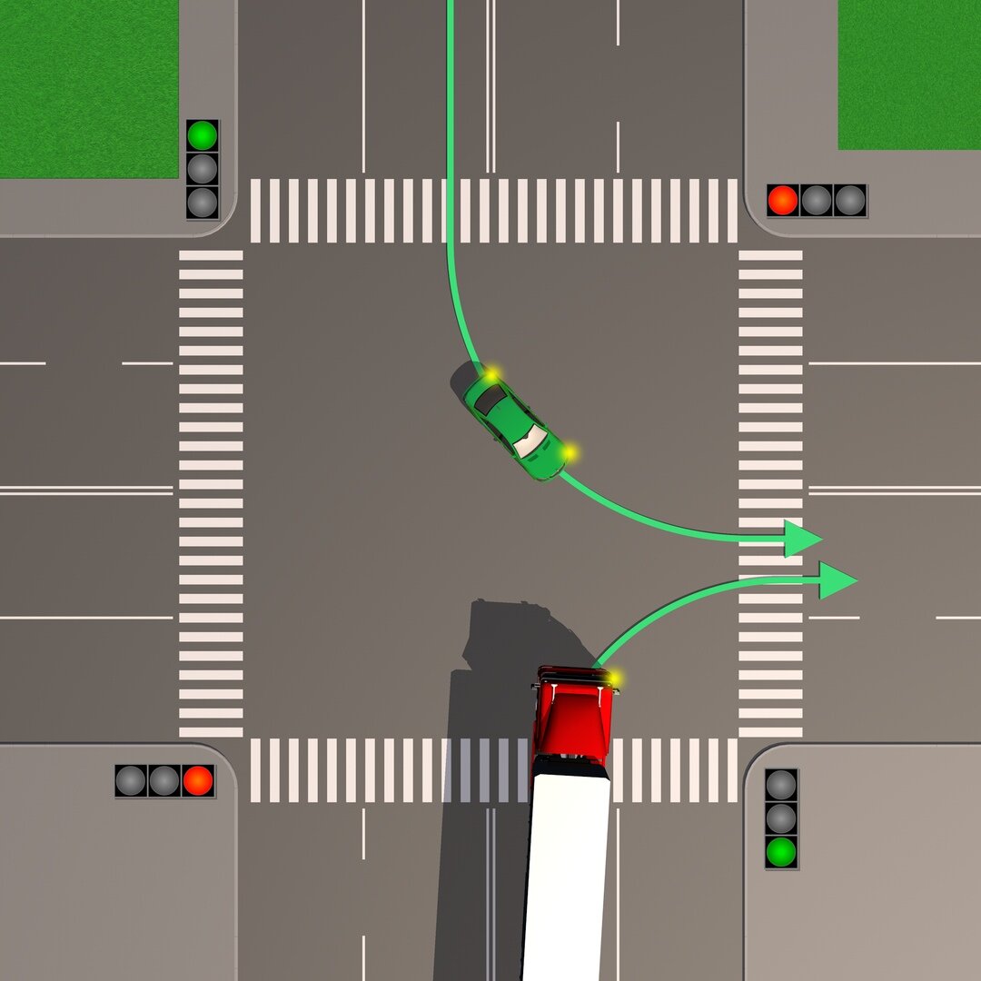 Доброго времени суток, уважаемые читатели! Очень часто подобная ситуация возникает на перекрестках, поэтому некоторые водители ошибочно трактуют данную спорной и от этого очень часто получается аварийная ситуация. Мы видим, что навстречу движутся два автомобиля у них у обоих горит разрешающий (зеленый) сигнал светофора. Мы видим, что водитель грузовика осуществляет поворот направо со второй полосы, что в принципе является нарушением п. 8.5 ПДД РФ цитата «Перед поворотом направо, налево или разворотом водитель обязан заблаговременно занять соответствующее крайнее положение на проезжей части, предназначенной для движения в данном направлении», но если учитывать габариты грузового автомобиля, то поворот направо с первой полосы ему невозможен, поэтому для него действует п. 8.7 ПДД РФ цитата «Если транспортное средство из-за своих габаритов или по другим причинам не может выполнить поворот с соблюдением требований пункта 8.5 Правил, допускается отступать от них при условии обеспечения безо