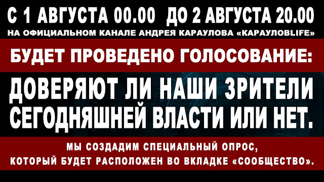 Голосование о доверии власти и Путину. С 1 августа 00.00 до 2 августа 20.00 на официальном канале Андрея Караулова «КарауловLIFE» будет проведено голосование: доверяют ли наши зрители сегодняшней власти или нет. Мы создадим специальный опрос, который будет расположен во вкладке «Сообщество». Голосование о доверии власти и Путину. ГлавТема Народ. Загрузка... ... Во вкладке "СООБЩЕСТВО" будет вопрос - "Доверяете власти или нет?" Если доверяете ставите галочку в окошечке "Да", если не доверяете - в окошечке "Нет". Нам важно мнение каждого нашего зрителя!