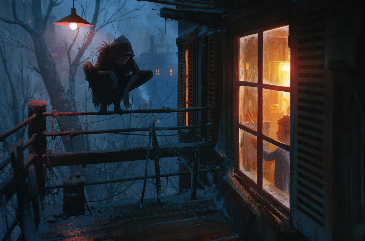 Стук прекратился. Кто-то стал шагать вокруг сторожки приговаривая: "Пусти меня внутрь, пожалуйста! Здесь так холодно, мне страшно.." Затем, нечто подошло к окну и уставилось в него. Мальчик боялся смотреть в него, но из-за яркого света луны на полу сторожки показался силуэт. С большим мехом и широкими плечами оно ждало его появления у окна.
