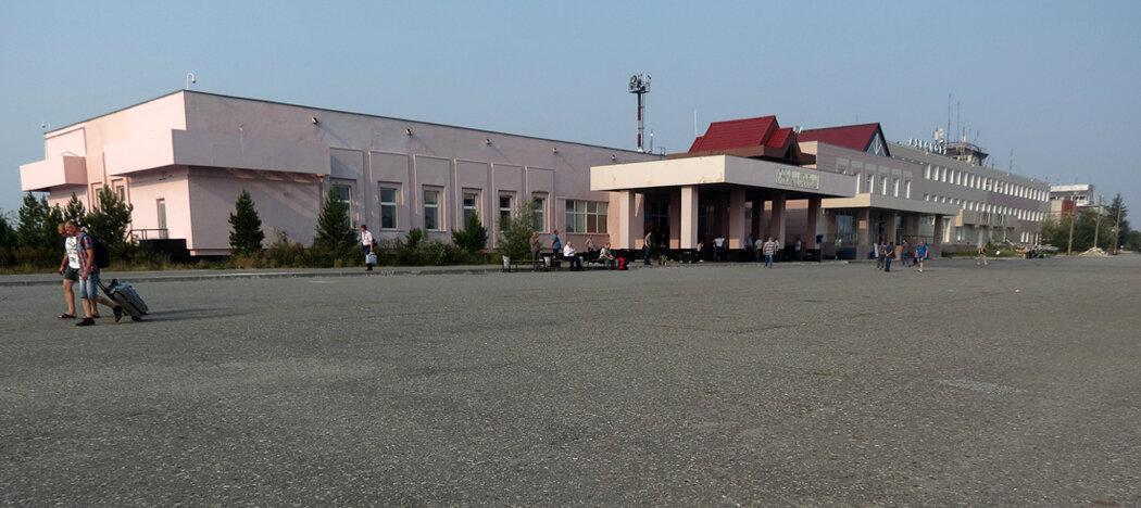 Вид аэровокзала из посёлка. За неимением наземных дорог въездная стела стоит прямо здесь: