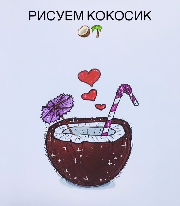 Летняя иллюстрация готова! Напоминаю, что использовать вы можете любые художественные материалы. Например, один из моих учеников нарисовал кокос по уроку акварелью: