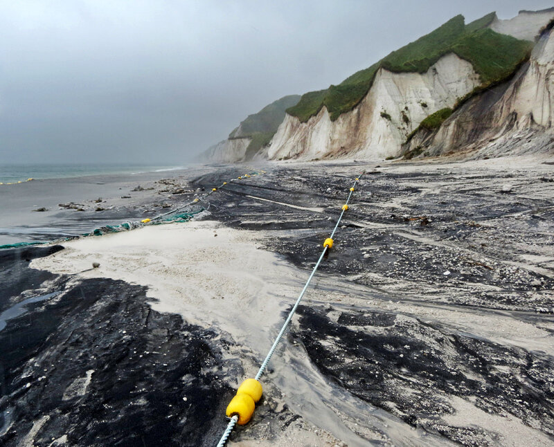 Ветровой перешеек сложен пемзой, и именно она образует эти белые яры у Охотского моря, непрерывной стеной тянущиеся на 8 километров.