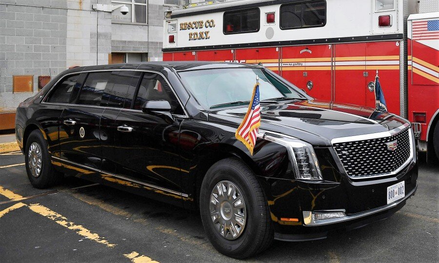 Cadillac. Данная модель отличается от серийной тем, что она очень тяжелая и имеет наивысший уровень защиты, для каждого хозяина Белого Дома строят новый лимузин, поэтому в 2018 году Трамп обновил свой автомобиль на новый Cadillac которому дали прозвище "Зверь". Технические характеристики автомобиля, конечно не разглашаются, мы можем лишь предположить, что в автомобиль уверенно влезут 7 человек, длина же авто составляет 8 метров, а вес в районе 8 тонн. Все связано с безопасностью, под капотом данного автомобиля разместился V8, который развивает 445 лошадиных сил, что касается обороноспособности, то