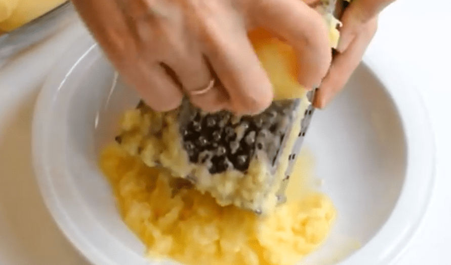 Лучше всего, сначала натереть лук, а потом, на натёртый лук — натирать картофель. Лук не даст картофелю почернеть. Чистим 1 лук, промываем его и натираем на самой мелкой тёрке. Далее чистим и моем картофель и так же натираем на самой мелкой тёрке. Если у вас есть кухонный комбаин с насадкой для дранников, то это заметно ускорит вашу готовку.