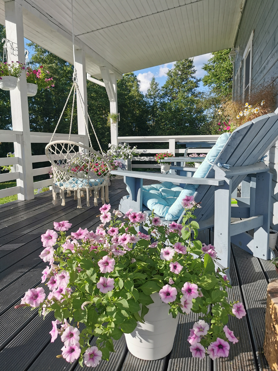 Мои любимые однолетники — яркие и нежные петунии. С тех пор как мы построили дом, я украшаю ими террасу и высаживаю на клумбе перед домом. Цветут они все лето, вплоть до заморозков, при этом не требуют особого ухода.
