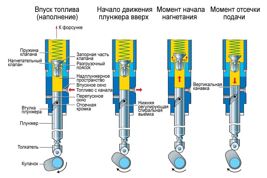- Основной. Осуществляется при целенаправленном движении плунжера вниз, направлен на качественное смесеобразование во всех режимах работы ДВС. чем больше давление, тем больше дизеля впрыскивается в камеру ДВС.