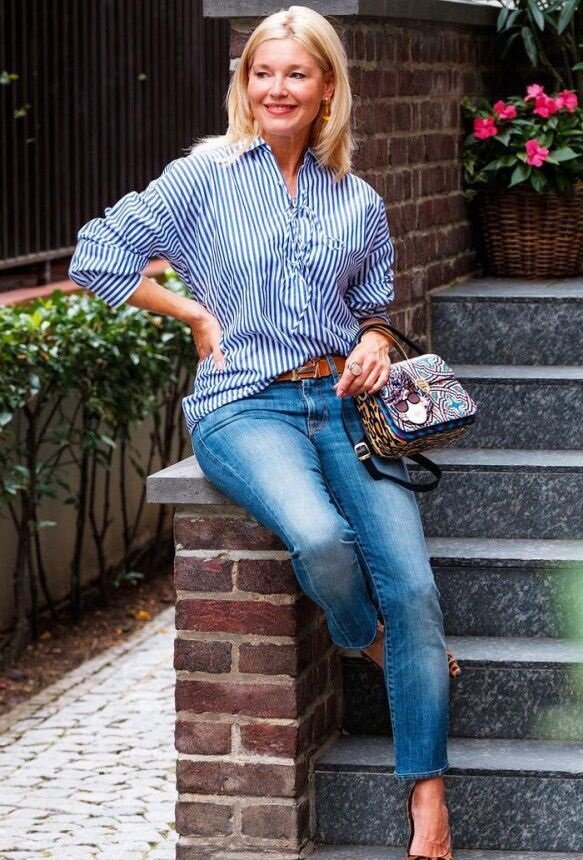 Джинсовая одежда не имеет возраста, её носят и малыши, и подростки, и взрослые. Однако выбирать модели стоит все же с учетом того, сколько вам лет. Джинсы подросткового стиля не сделают женщину средних лет моложе, напротив, они только подчеркнут возрастные изменения. И не стоит забывать о других видах джинсовой одежды – юбках, платьях, рубашках, куртках. Приведу несколько примеров джинсовых образов для женщин элегантного возраста.